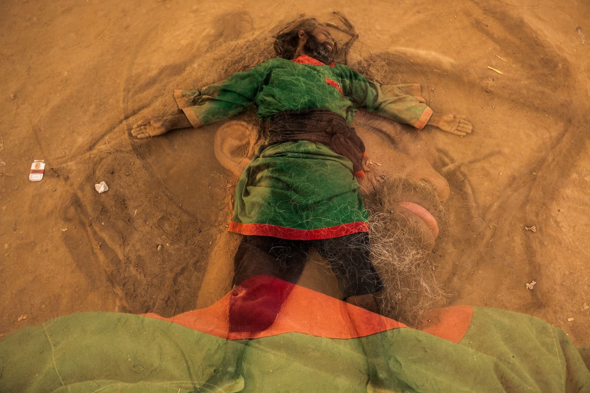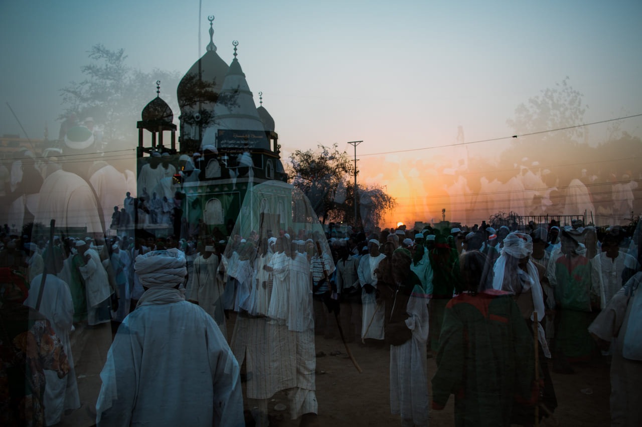 The photographs are reflective of the Sufi practices that are rooted in movement. Through Elsadig’s techniques of blur, stop motion and multiple exposure the images capture the embodied practice of spiritual gathering and trance. Elsadig also focuses on the objects of ritual that are used to adorn the pilgrims’ bodies and illuminate the ritual. The artworks often enmesh the spatial context of the place, the individual subjects and the material artefacts of the experience. His techniques thus amplify the connectedness between location, body and materiality rather than to objectify the sacred.