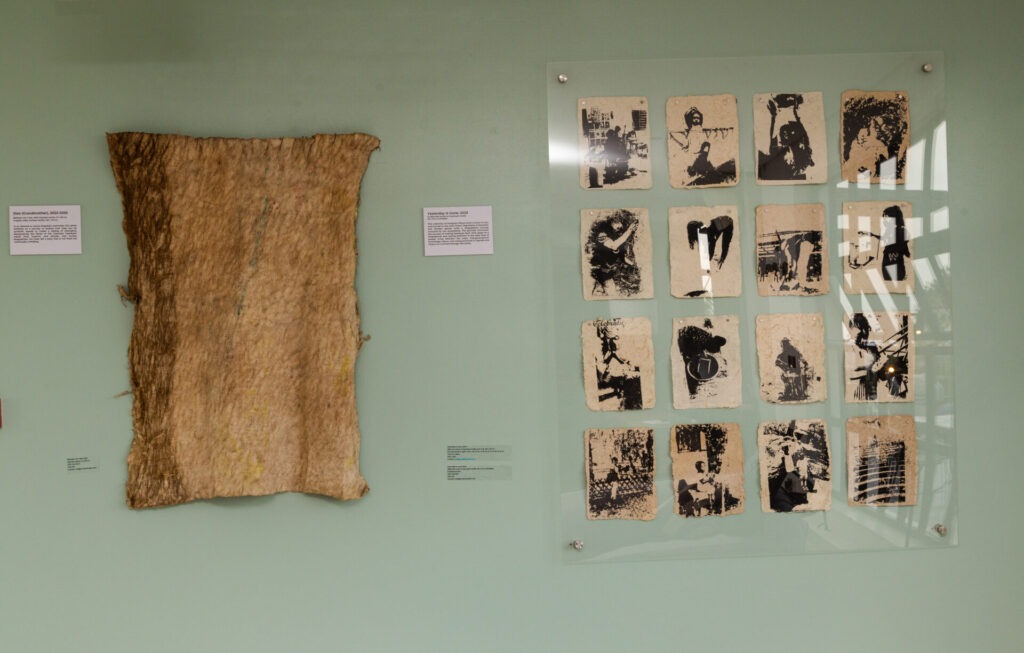 This immersive exhibition invites audiences into a deeply personal yet universally resonant exploration of memory, nature, and transformation. It presents three different kinds of fabrics juxtaposed together: Kyenkyen, Dawadawa, and Lubugo. Made in Ghana and Uganda, the materials connect two traditions of textile making. In a bid to express these memories of familiar spaces, the tree bark is a symbol of protection and perseverance.