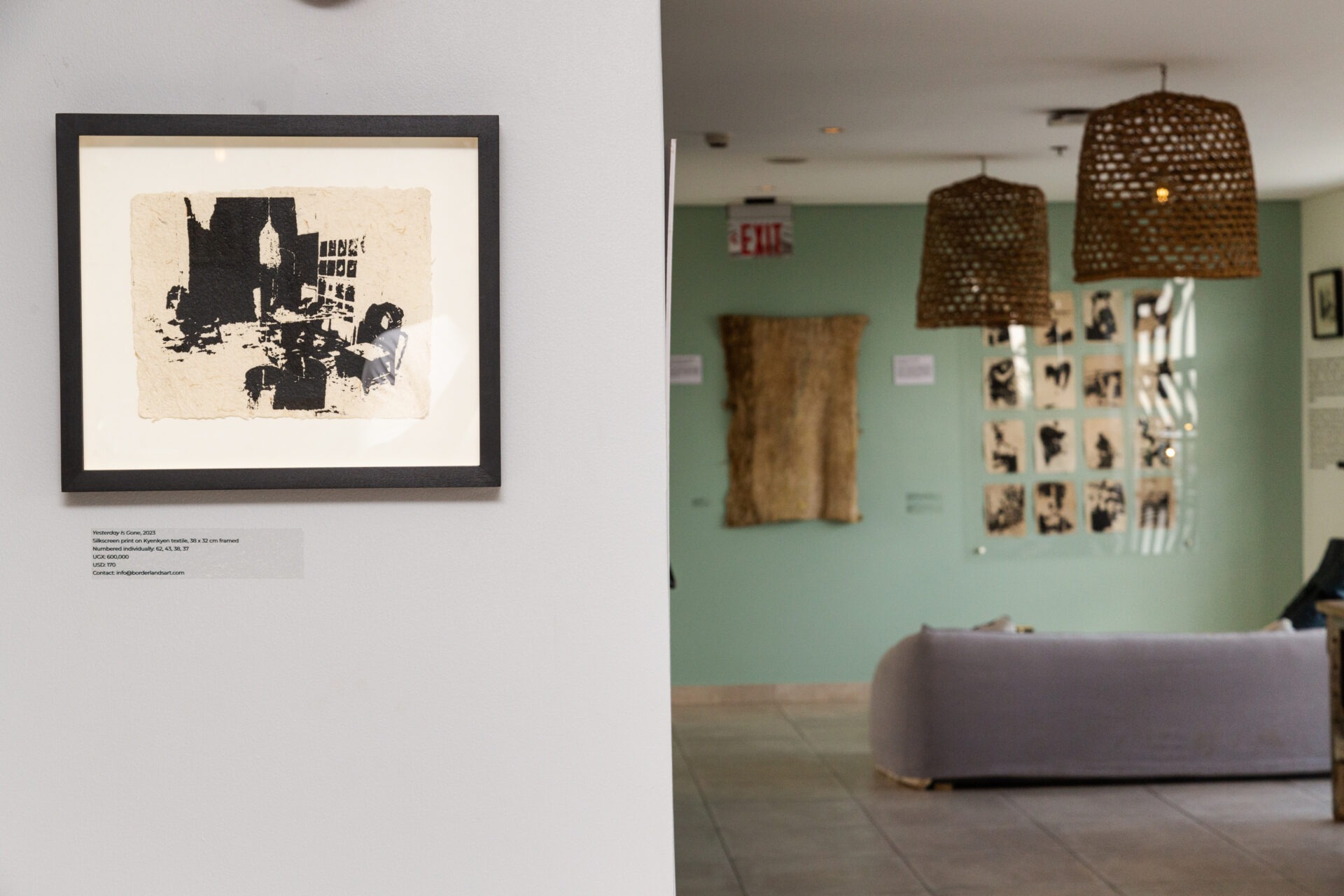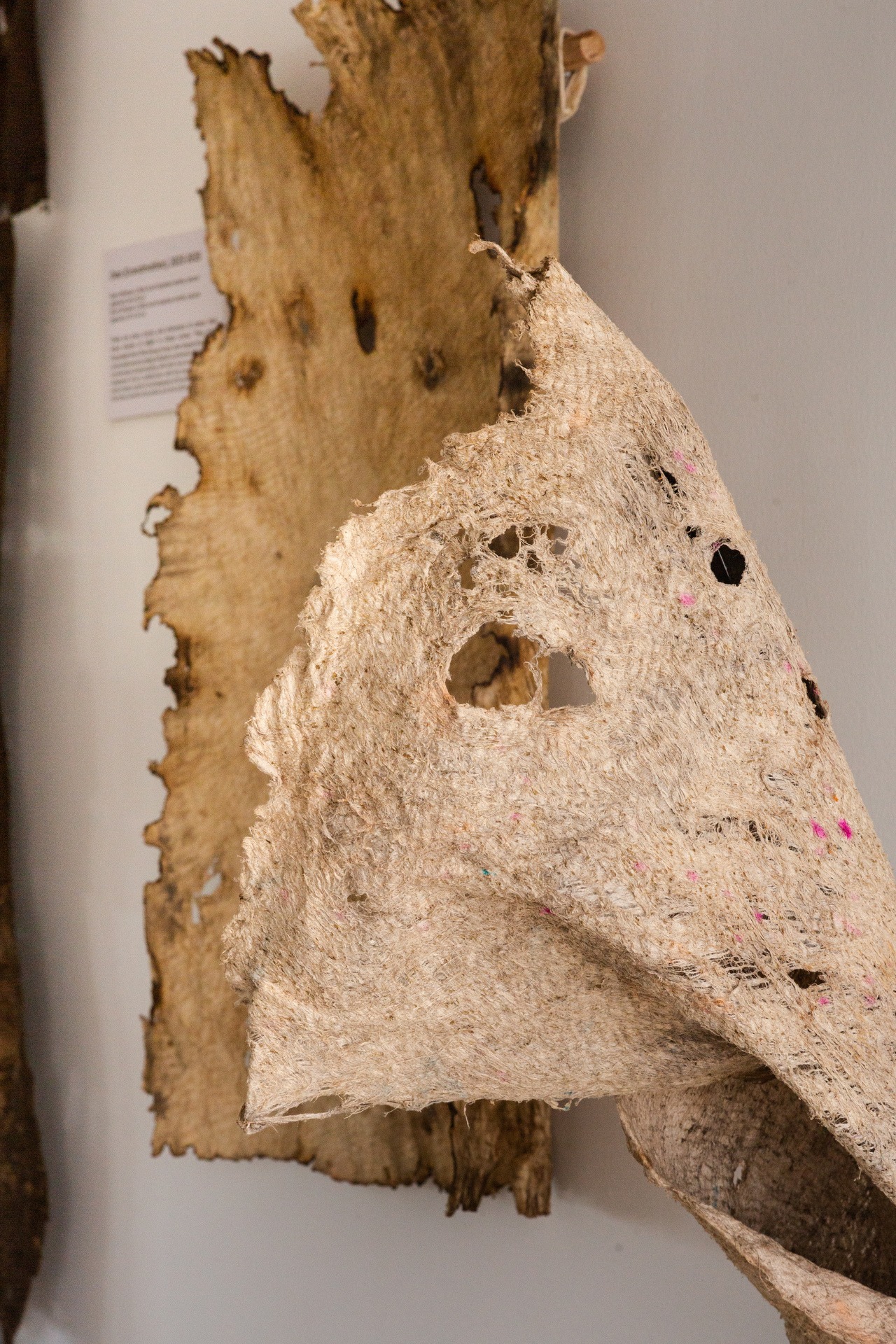 This immersive exhibition invites audiences into a deeply personal yet universally resonant exploration of memory, nature, and transformation. It presents three different kinds of fabrics juxtaposed together: Kyenkyen, Dawadawa, and Lubugo. Made in Ghana and Uganda, the materials connect two traditions of textile making. In a bid to express these memories of familiar spaces, the tree bark is a symbol of protection and perseverance.