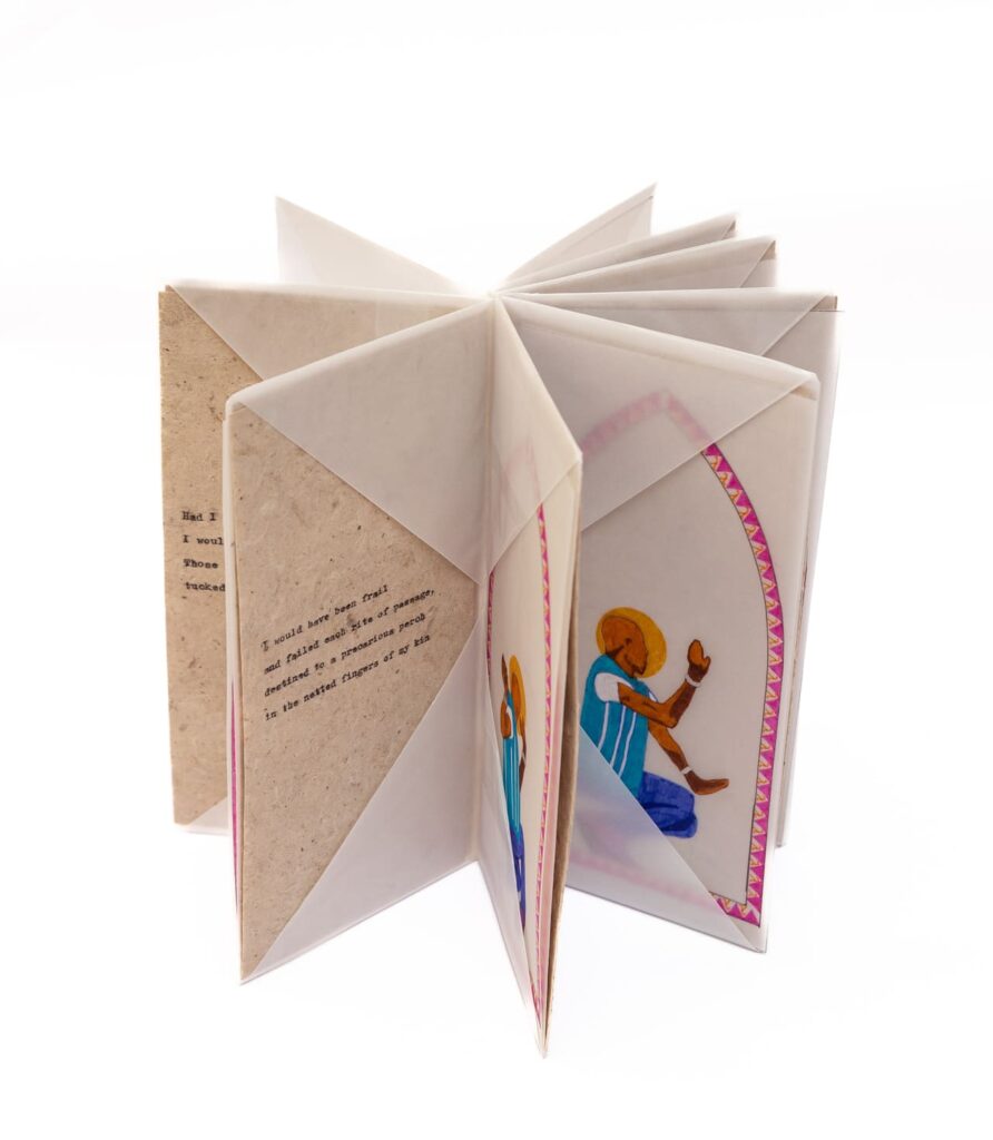 Three female artists from Uganda and Benin present textiles, zines, and photography that reimagine contemporary African experiences through materials, memory, and the environment. Charity Atukunda (Uganda), Gloria Kiconco (Uganda), and Laeïla Adjovi (Benin) showcase large-scale hand-painted kangas (traditional East African fabrics with proverbs), small, intimate sculptural zines made from Lubugo (Ugandan barkcloth), and photography as well as a cyanotype print on cotton. The range of works are tied together by their materiality and perspectives, taking traditional materials as the source for creating contemporary artworks.